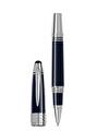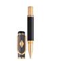 Корпус, покрытый драгоценным черным лаком, элегантно дополняет колпачок из черно-белого лака с тонкой полоской. Зажим в виде купюродержателя символизирует силу денег, а его скругленное отверстие украшено монограммой Джея Гэтсби в стиле ар-деко. Конус, имитирующий завинчивающуюся крышку фляги с гравировкой и кольцами в цветах американского флага, отсылает к стильным аксессуарам эпохи. Завершает образ эмблема Montblanc из перламутра, чей мерцающий блеск был источником вдохновения для ювелиров того времени. MB130655