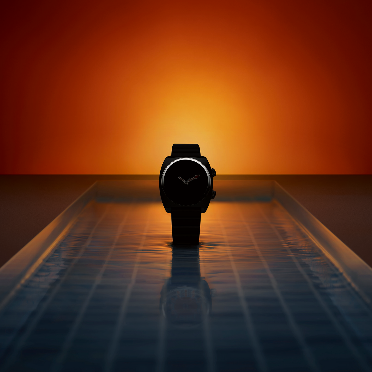 Стрелки и индексы покрыты светящимся составом, который излучает насыщенное голубое свечение в темноте. Шрифт цифр выполнен в ретро-футуристичном стиле, отсылая к оригинальной версии часов.