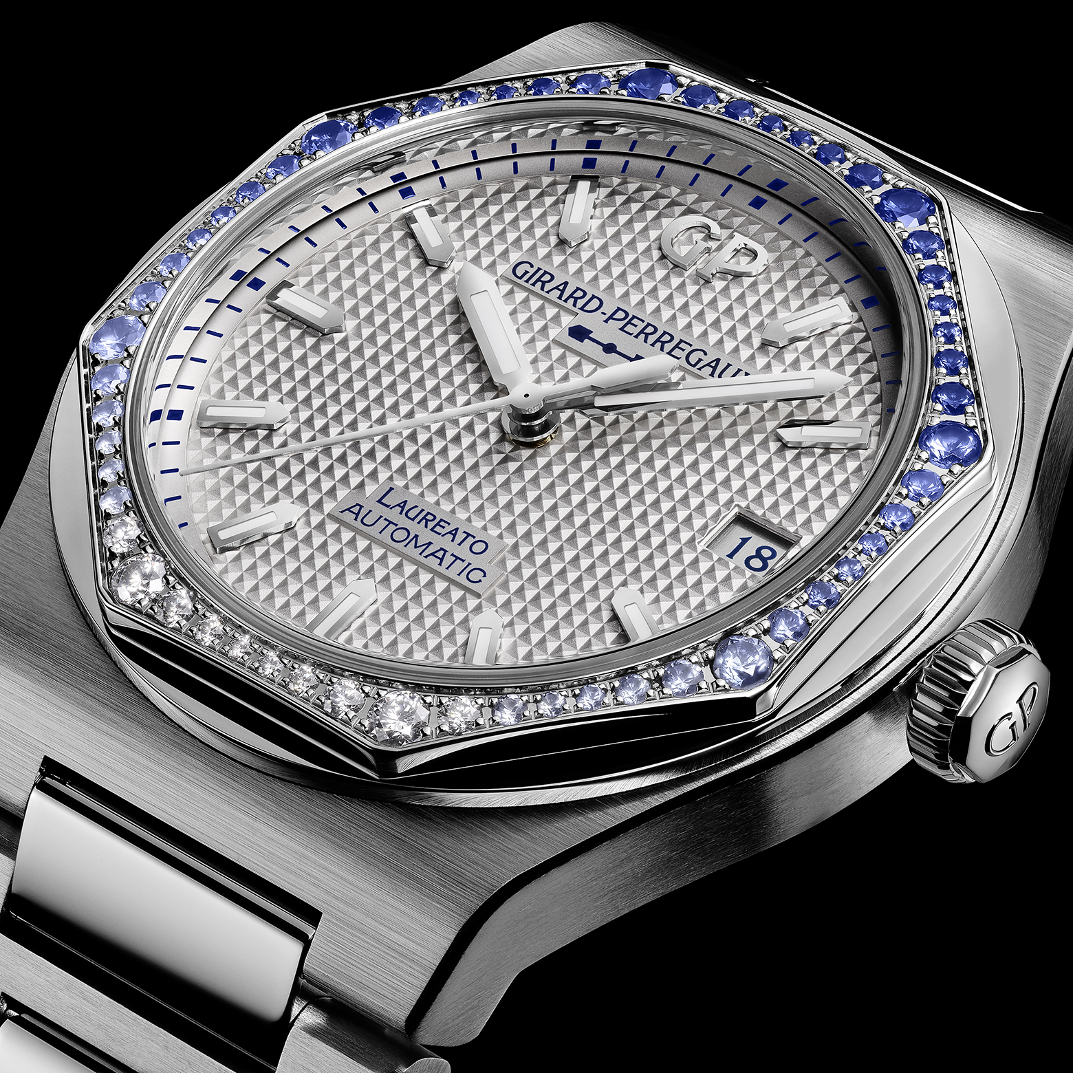 Для тех, кто ищет более ярких акцентов, Girard-Perregaux представляет еще одну версию Laureato, украшенную бриллиантами. Ее безель сияет десятью бриллиантами (около 0,177 карата) и сорока шестью сапфирами с бриллиантовой огранкой (приблизительно 0,798 карата). Бриллианты размещены у отметки 6 часов, а остальную часть безеля занимают сапфиры, чей синий цвет постепенно насыщается, становясь глубже к 12 часам. Этот плавный переход оттенка гармонирует с размером камней, которые незаметно уменьшаются. Самые крупные сапфиры расположены по углам восьмиугольного безеля. Помимо градиентного эффекта на безеле, бриллианты тщательной огранки подобраны так, чтобы подчеркнуть узнаваемую восьмиугольную форму Laureato. Серый циферблат с гильошированным узором "Clous de Paris" оживлен синими надписями.