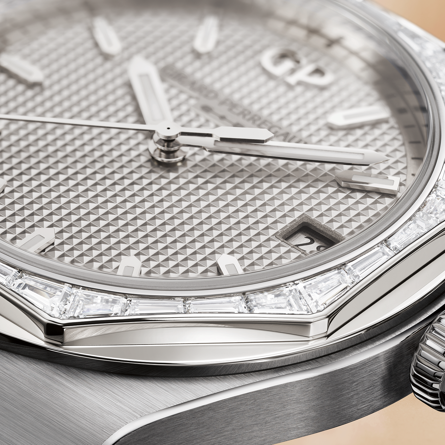Отличительной чертой этих часов является безель, украшенный 32 бриллиантами багетной огранки общей массой около 3 карат, что свидетельствует о виртуозности мастера-ювелира. Огранка «багет» предполагает ювелирную точность, которая обеспечивается специально спроектированным безелем. Каждый камень аккуратно размещен в канале, конструкция которого учитывает незначительные колебания в размерах и очертаниях, гарантируя идеальное совмещение. Оптимально подобранная высота безеля подчеркивает блеск бриллиантов, наделяя часы неподражаемой элегантностью. Эта кропотливая работа по установке камней дополнительно облагораживается уникальной геометрией восьмиугольного безеля Laureato, чей канал плавно расширяется к углам, подстраиваясь под различные размеры бриллиантов.