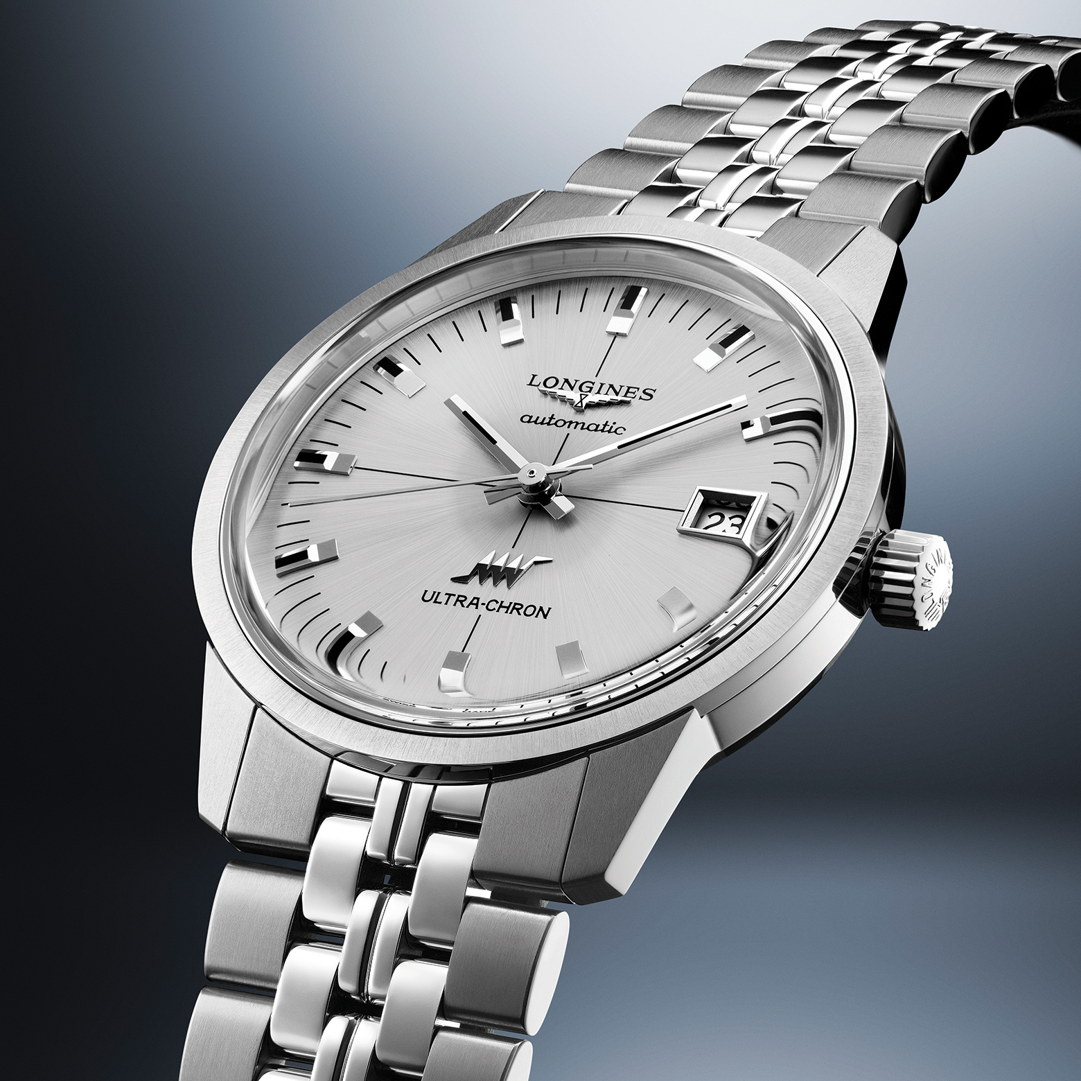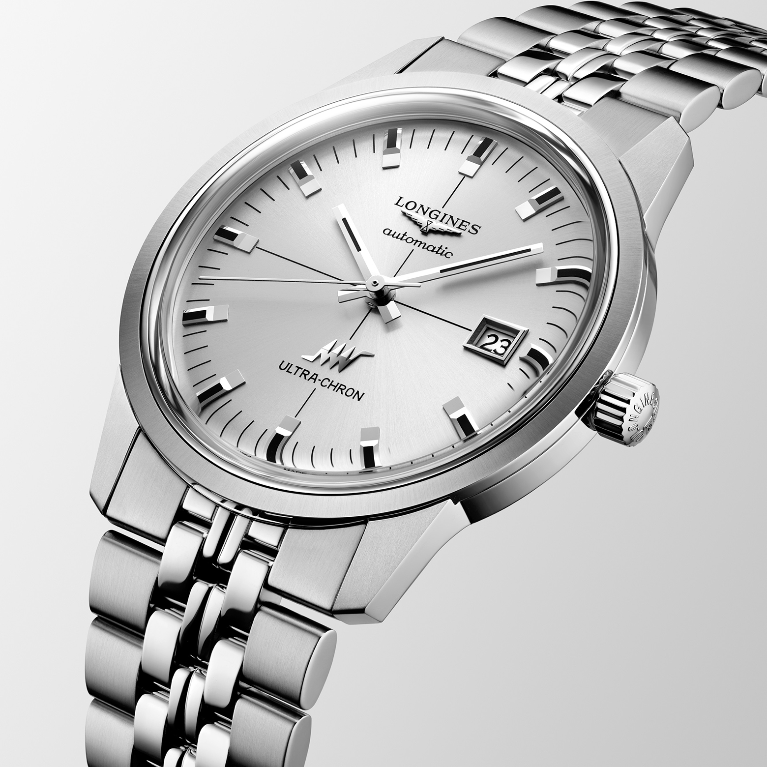 В 2025 году Longines вновь обратилась к этой иконе, переосмыслив ее для удовлетворения практических потребностей современного ношения. Ultra-Chron Classic сохраняют характерные черты дизайна своего предшественника: куполообразный серебристый циферблат с эффектом солнечных лучей улавливает свет с той же утонченной элегантностью, что и оригинал. Накладные полированные серебристые индексы и стрелки сохраняют аутентичную эстетику, в то время как отличительное трапециевидное окошко даты в положении «3 часа», выполненное винтажным шрифтом оригинальных Ultra-Chron, наряду с повышенной водонепроницаемостью до 5 бар, обеспечивает практическую функциональность без ущерба для вневременного характера часов.