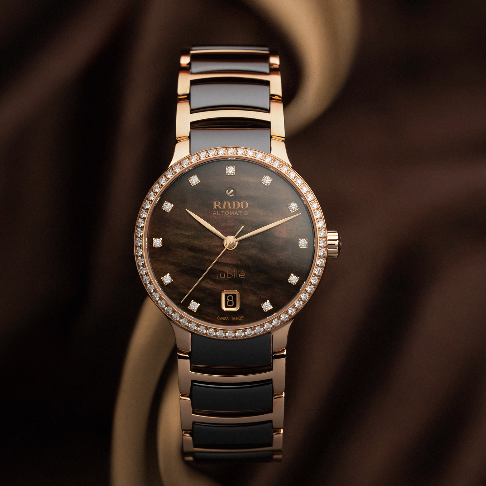 Принцип эстетического равновесия отражен и в техническом исполнении. Лаконичный циферблат с тремя стрелками оттенка розового золота, апертурой даты в положении «6 часов» и узнаваемым подвижным якорем Rado под отметкой «12» создает ощущение чистоты и порядка. Скромная, но значимая надпись «Jubilé» над окном даты служит негласным подтверждением для ценителей: в отделке использованы исключительно натуральные бриллианты.