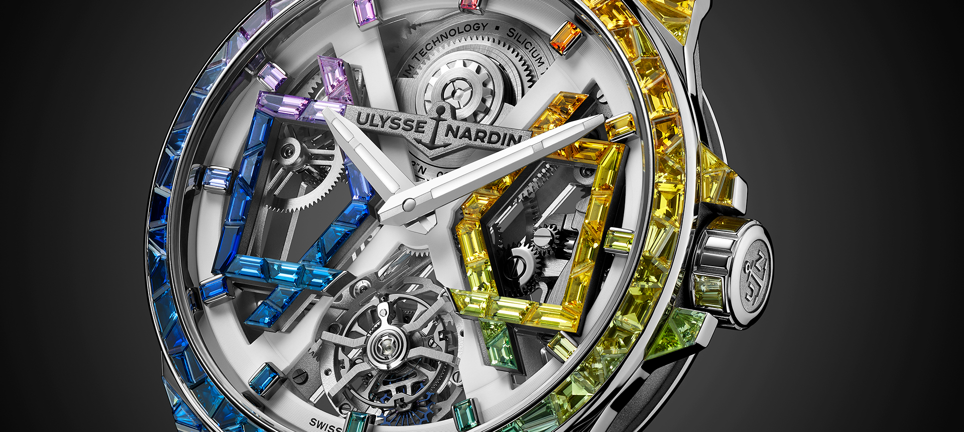 С неустанным стремлением к идеалу, свойственным Ulysse Nardin, сапфиры для Blast [Sparkling Rainbow] были отобраны с особой тщательностью. Каждый самоцвет плавно переходит в соседний с удивительной непринужденностью, формируя изысканный и завораживающий градиент радуги, опоясывающий корпус, безель, заводную головку и циферблат часов на все 360 градусов.