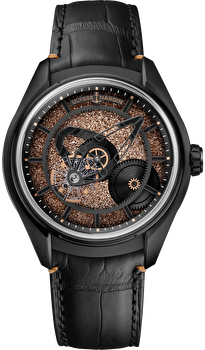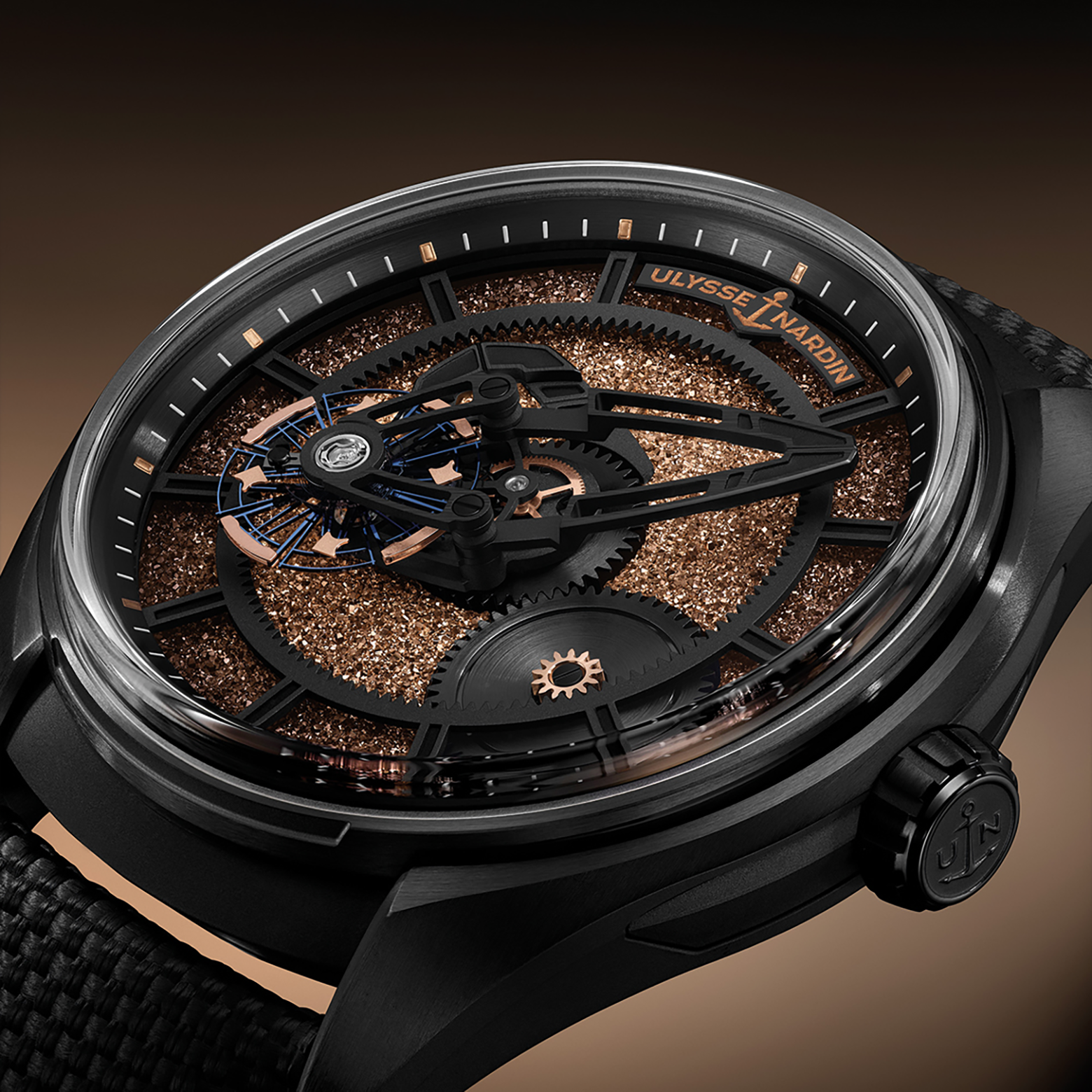 Freak [X Crystalium] от Ulysse Nardin это воплощение дерзкого часового авангарда. Часы заключены в 43-миллиметровый корпус из титана с DLC-покрытием и дополнены безелем того же оттенка, создающим идеальный фон для уникального циферблата. Центральное место на нём занимает вращающийся диск Crystalium, мерцающий оттенками розового золота. Этот яркий акцент контрастирует с насыщенным тёмным фоном, придавая часам невероятную визуальную глубину.