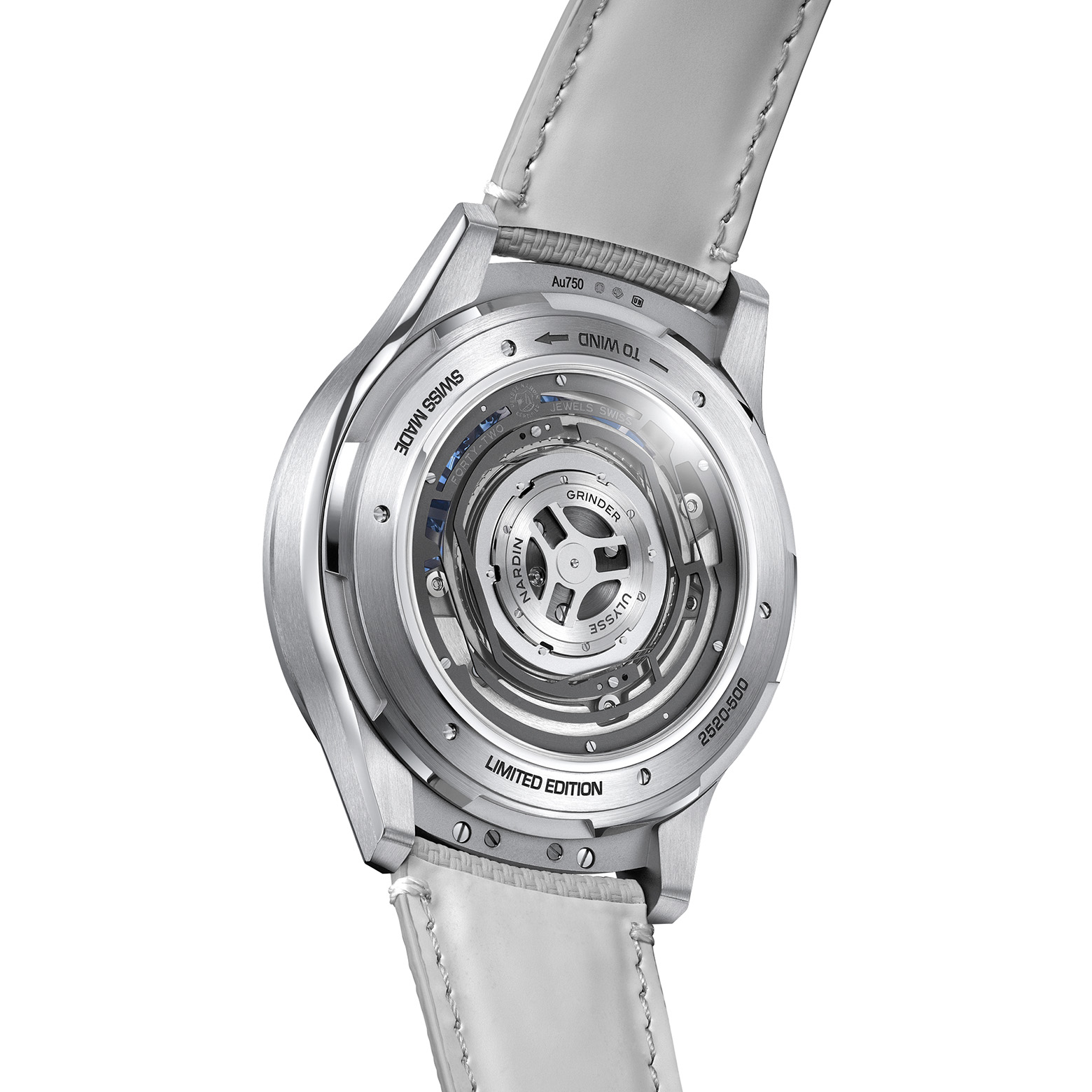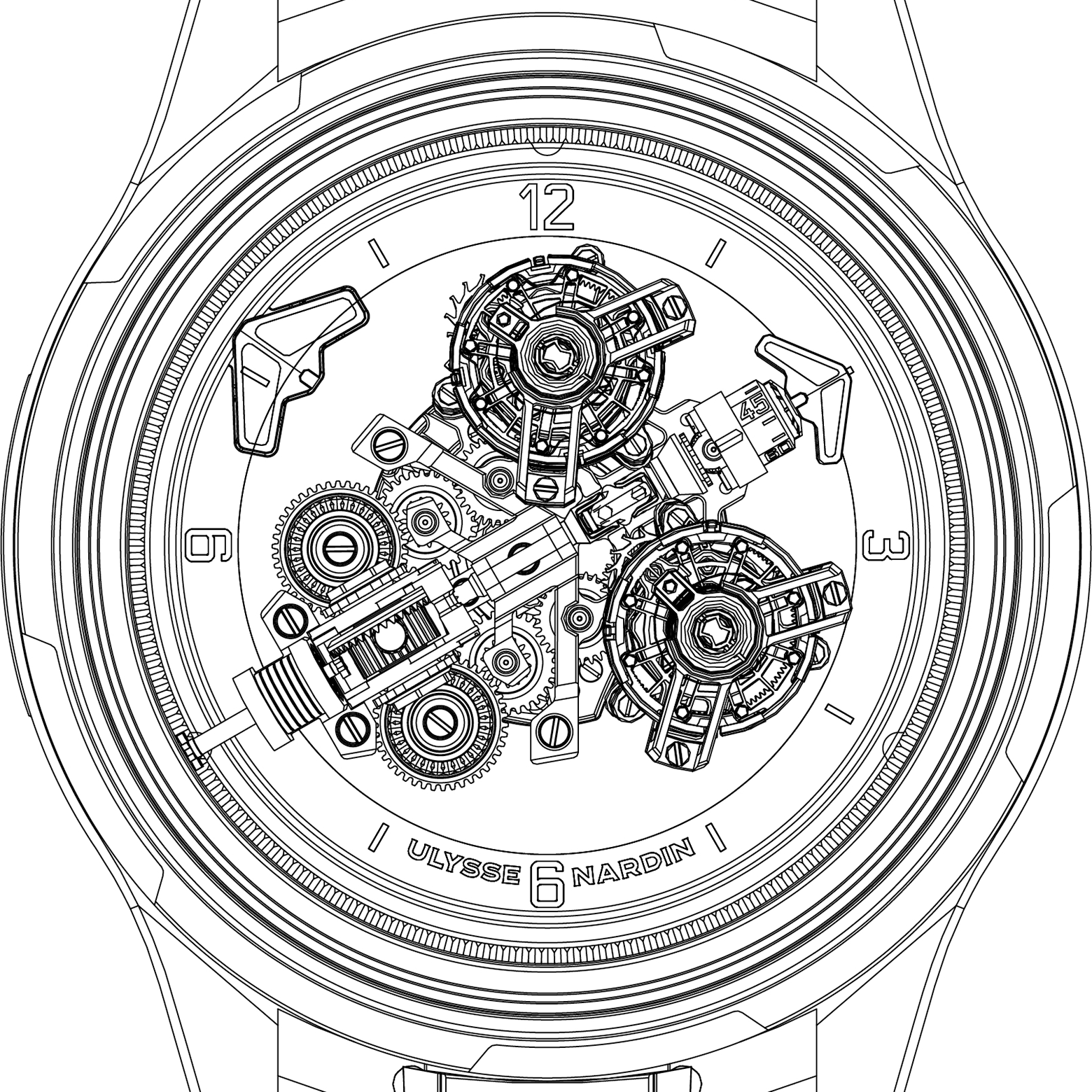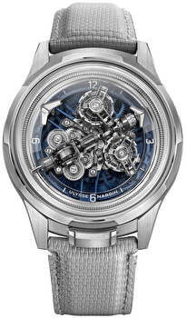 Функционирование двойного турбийона подразумевает колоссальные энергозатраты, справиться с которыми под силу лишь инновационной системе автоподзавода Grinder®. Эта запатентованная технология Ulysse Nardin признана наиболее эффективной в индустрии, обеспечивая бесперебойную работу сложнейшего узла. Специально для данного калибра мастера бренда спроектировали обновленный корпус из белого золота диаметром 44 мм. Обладая улучшенной эргономикой, он ощущается на руке комфортнее предшественников, а модернизированный фиксатор безеля стал более компактным и утонченным, подчеркивая премиальный облик устройства.