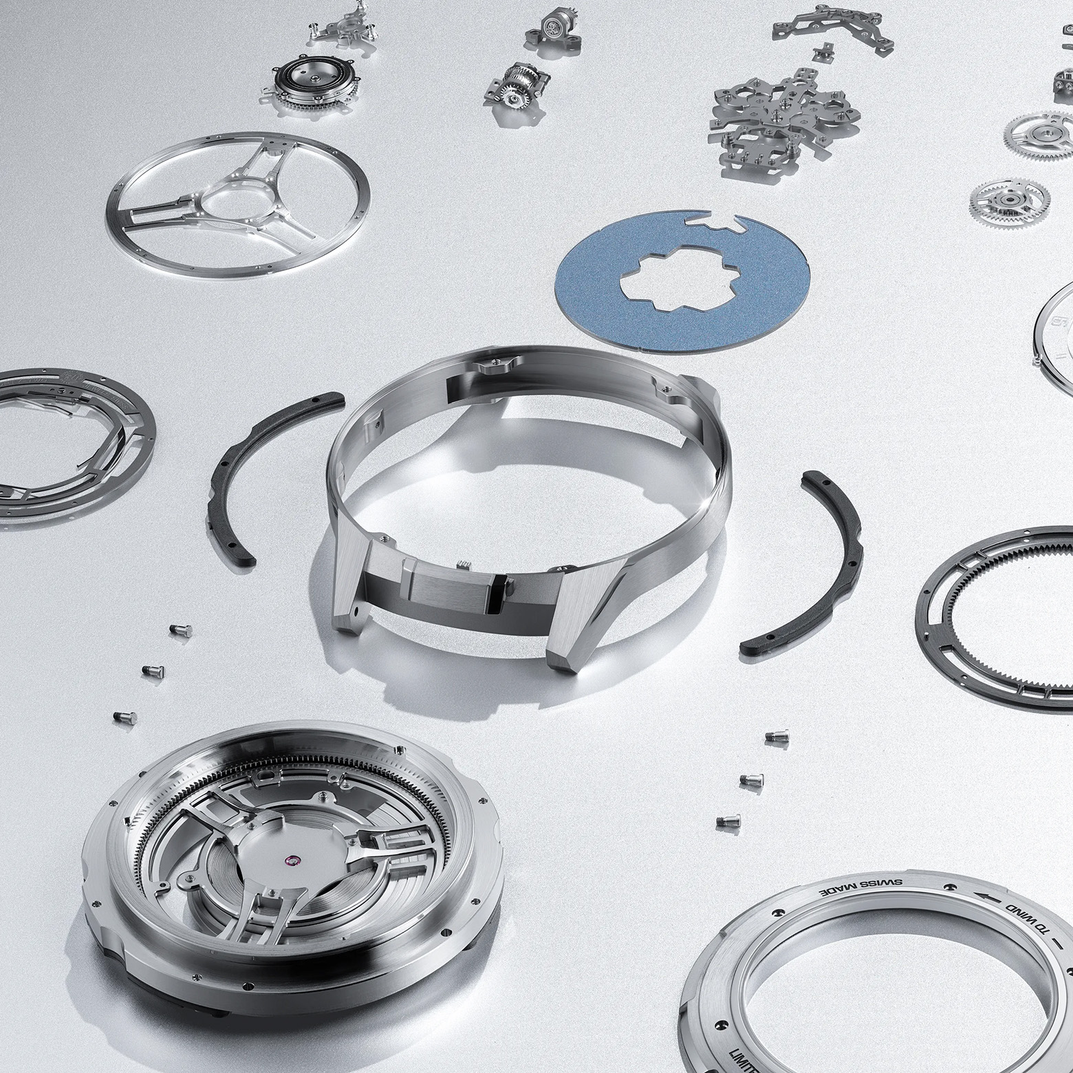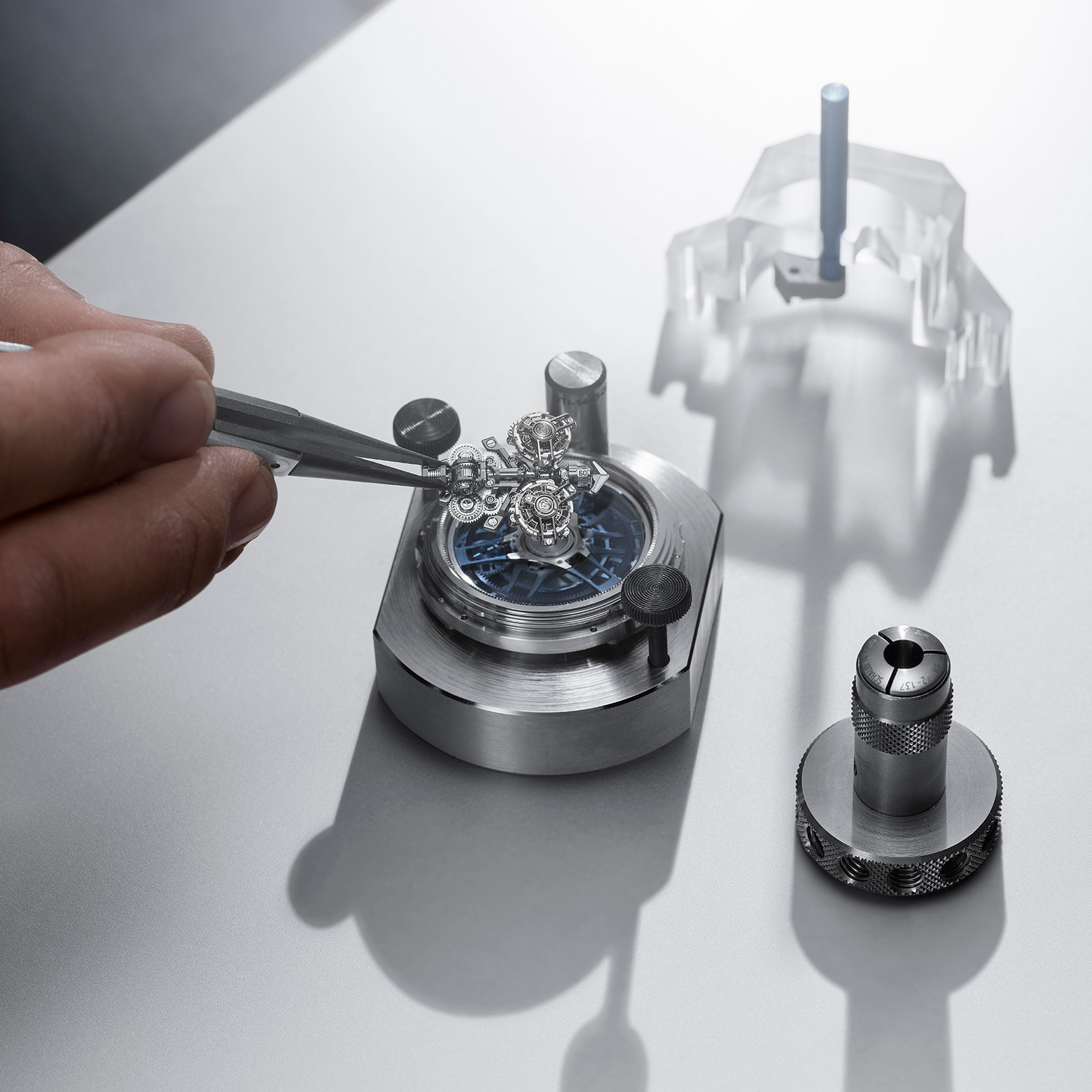 Благодаря коллаборации со швейцарскими экспертами из MPS, специализирующимися на высокоточной биомедицинской и космической инженерии, компоненты были изготовлены с допуском в один микрон. Адаптация столь сложной гироскопической системы для часового калибра стала уникальным технологическим прорывом, позволившим эффективно управлять подвижной механической архитектурой и гарантировать безупречную точность передачи импульса внутри сложного механизма.