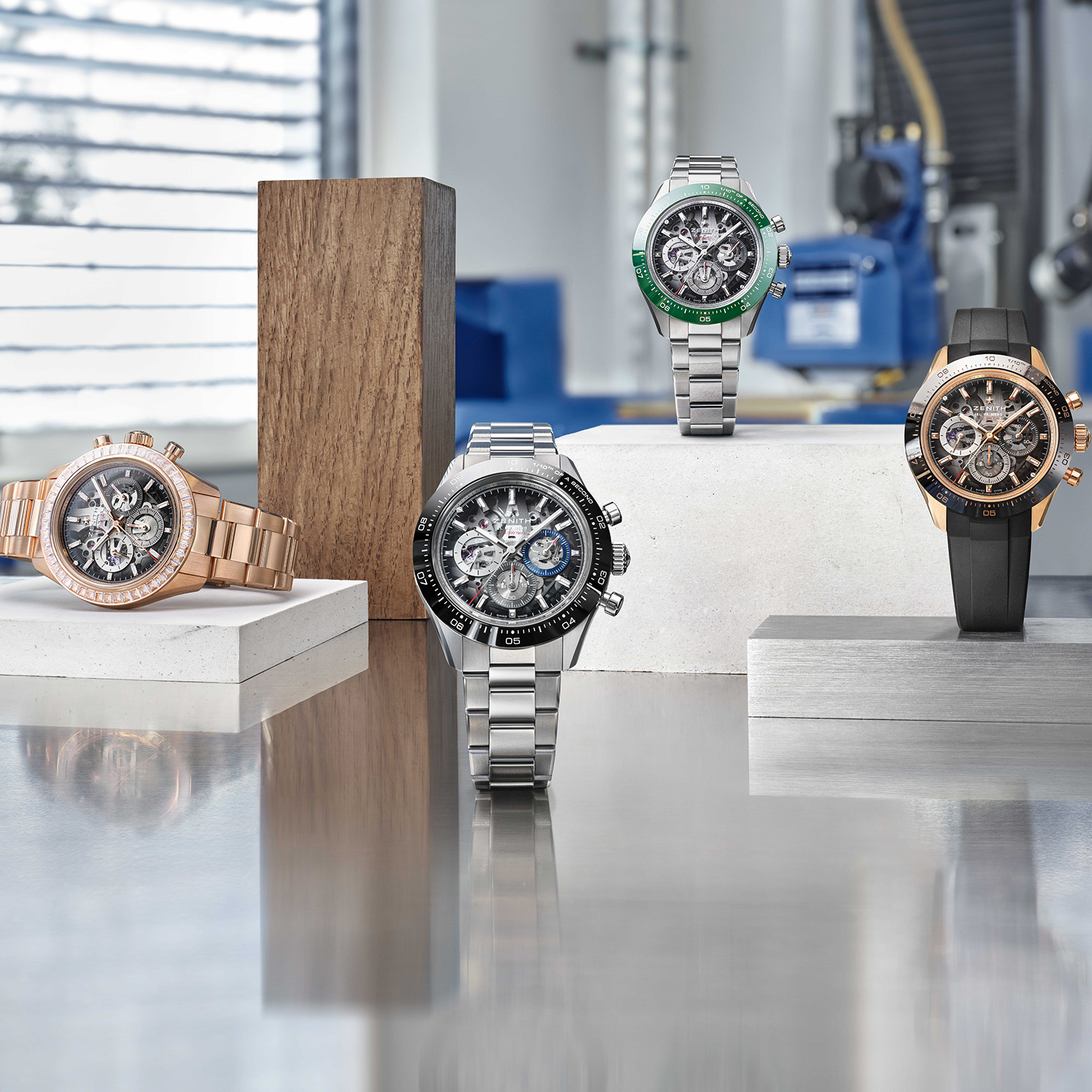 Стальной 41-миллиметровый корпус сочетает в себе атлетичный дизайн и премиальную отделку, дополненную керамическим безелем с измерительной шкалой. Часы, обладающие водозащитой 100 метров, выпускаются в нескольких исполнениях: с зеленым или черным безелем, а также характерными разноцветными счетчиками. В комплект входят как классический металлический браслет, так и практичный каучуковый ремешок, что делает аксессуар универсальным для любого образа.