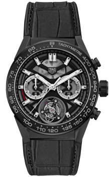 Потрясающее творение отличается исключительно легким парящим турбийоном на 6 часах. Великолепная черная отделка нанесена на колонное колесо, мосты хронографа, а также ажурный ротор и мосты. Корпус диаметром 45 мм. Водонепроницаемость до 100 метров, крепится удлиненными ушками к ремешку из матовой черной кожи аллигатора, пришитой к черной резине. Безель из тонко отшлифованной керамики. Серебристые вспомогательные циферблаты на 3 и 9 часах измеряют минуты и часы хронографа соответственно. Клетка парящего турбийона на одну минуту находится на 6 часах. Стрелки и индексы покрыты Super-LumiNova® для улучшения читаемости в темноте. CAR5A8Y.FC6377
