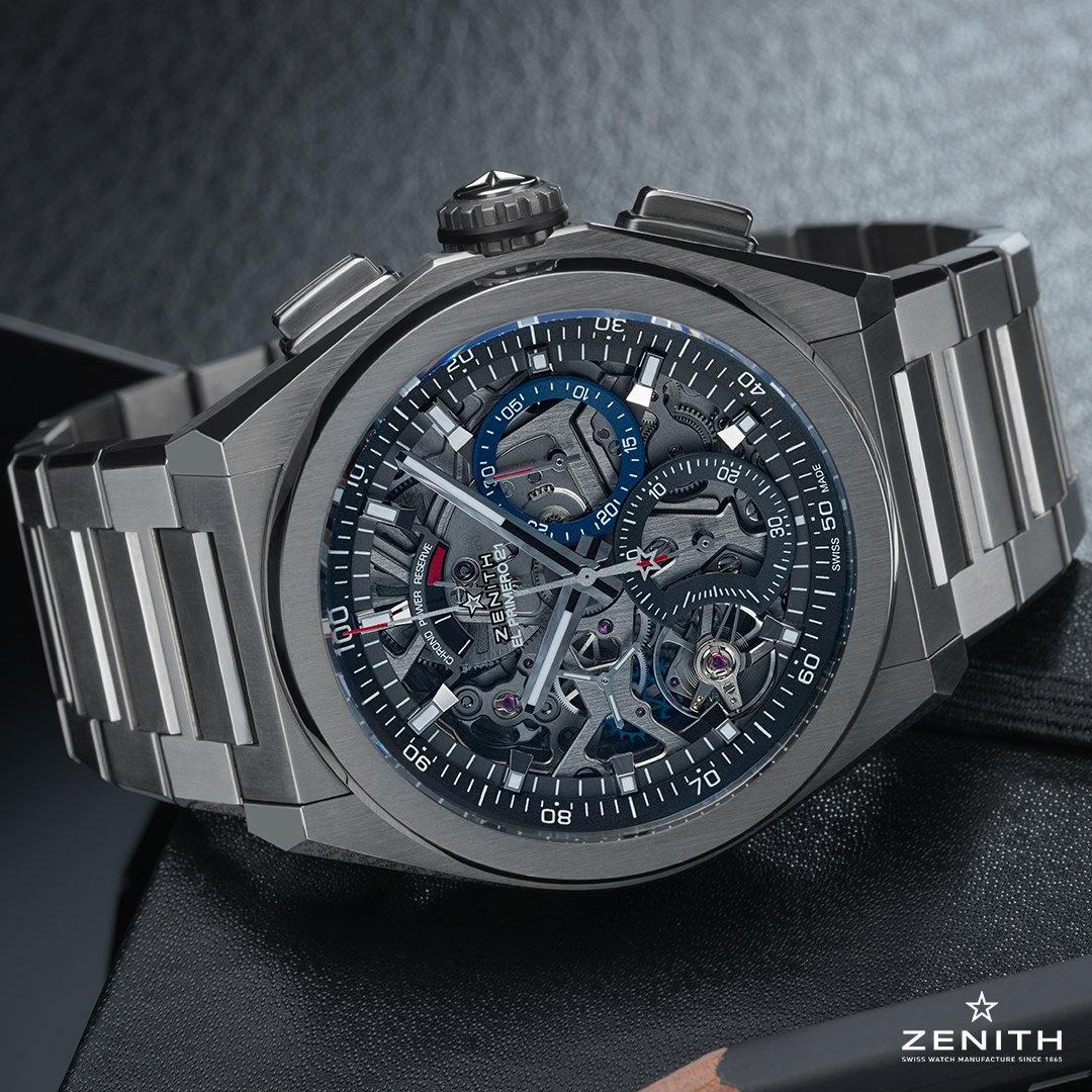 Модель Zenith DEFY EL PRIMERO 21 представляет квантовый скачок как в производительности, так и механическом дизайне. Это соревнование с самим собой. Усовершенствованный механизм этих выдающихся часов имеет частоту 360 000 полуколебаний в час (50 Гц) – это в десять раз выше, чем у ее легендарного предшественника, что делает возможным измерение времени с точностью до 1/100 доли секунды. Элегантный дизайн циферблата усиливает эффект невероятной частоты колебаний: внутренний безель имеет градуированную от 1 до 100 шкалу, по которой с молниеносной скоростью совершает свой оборот секундная стрелка, отсчитывающая сотую долю секунды, создавая таким образом захватывающий визуальный эффект и сюрреалистичное ощущение путешествия во времени. Вторя тенденциям современной инженерной разработки и обеспечивая оптимальную производительность, данное часовое усложнение становится возможным благодаря использованию меньшего количества деталей, минимизации кропотливой сборки и регулировки. Сертифицированный TIME LAB хронометр DEFY EL PRIMERO 21 отличается не только значительно улучшенной производительностью и механической структурой, но и своим дизайном, почерпнувшем вдохновение в строгой эстетике его предшественника 1969 года выпуска. Обрамленный в 44 мм корпус, изготовленный из титана 5-го класса, скелетонированный циферблат модели DEFY EL PRIMERO 21 олицетворяет основные отличительные характеристики легендарного оригинала в современном исполнении: Непрерывно движущаяся секундная стрелка с противовесом в форме звезды, широкие стрелки прямоугольной формы с люминесцентным покрытием и фацетированные часовые отметки дополняют друг друга в потрясающей картине футуристического великолепия.