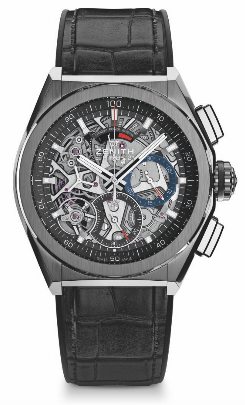 Как «лицо» новой линейки мужских часов Zenith, скелетонированный циферблат являет миру их элегантный и современный декор. Непрерывно движущаяся секундная стрелка с противовесом в форме звезды, широкие стрелки прямоугольной формы с люминесцентным покрытием и фацетированные часовые отметки: все основные отличительные особенности El Primero на месте, в том числе счетчики, выполненные в двух цветах, синем и темно-сером, и напоминающие о легендарном хронографе 1969 года.