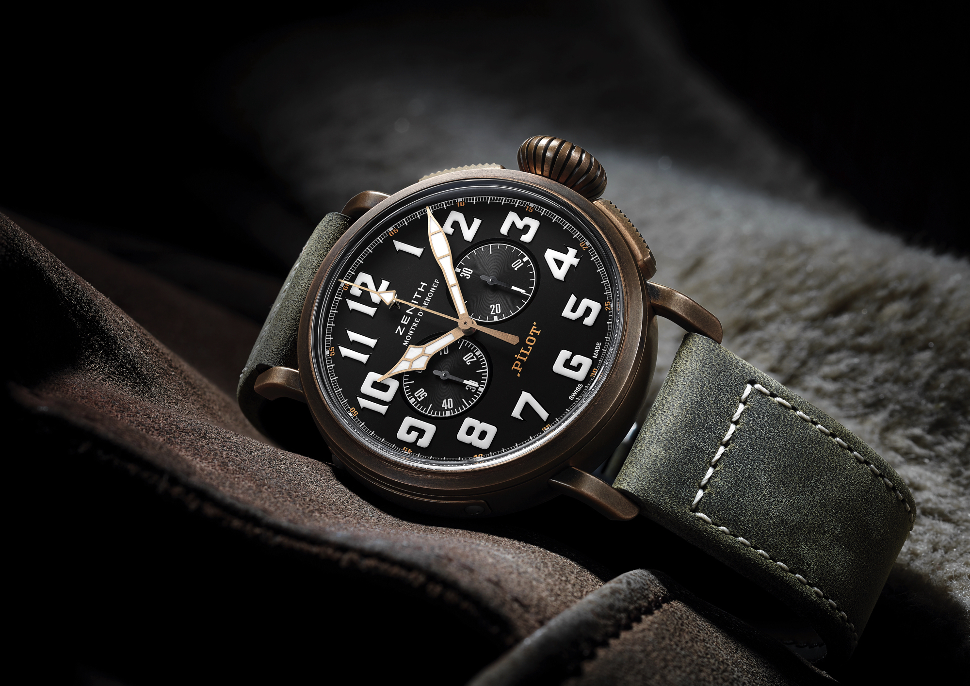 К коллекции Heritage марки Zenith присоединяется новая модель Pilot Extra Special Chronograph. Широкий корпус из бронзы диаметром 45 мм вмещает легендарный механизм – калибр автоматического хронографа El Primero 4069 – и демонстрирует винтажный удобочитаемый циферблат. Швейцарские часы Pilot Extra Special Chronograph органично вписываются в эту культовую коллекцию, состоящую из массивных и аристократичных часов. Черный циферблат с пескоструйной обработкой снабжен большими фигурными стрелками и крупными арабскими цифрами с люминесцентным покрытием Super-LumiNova® SLN C1.